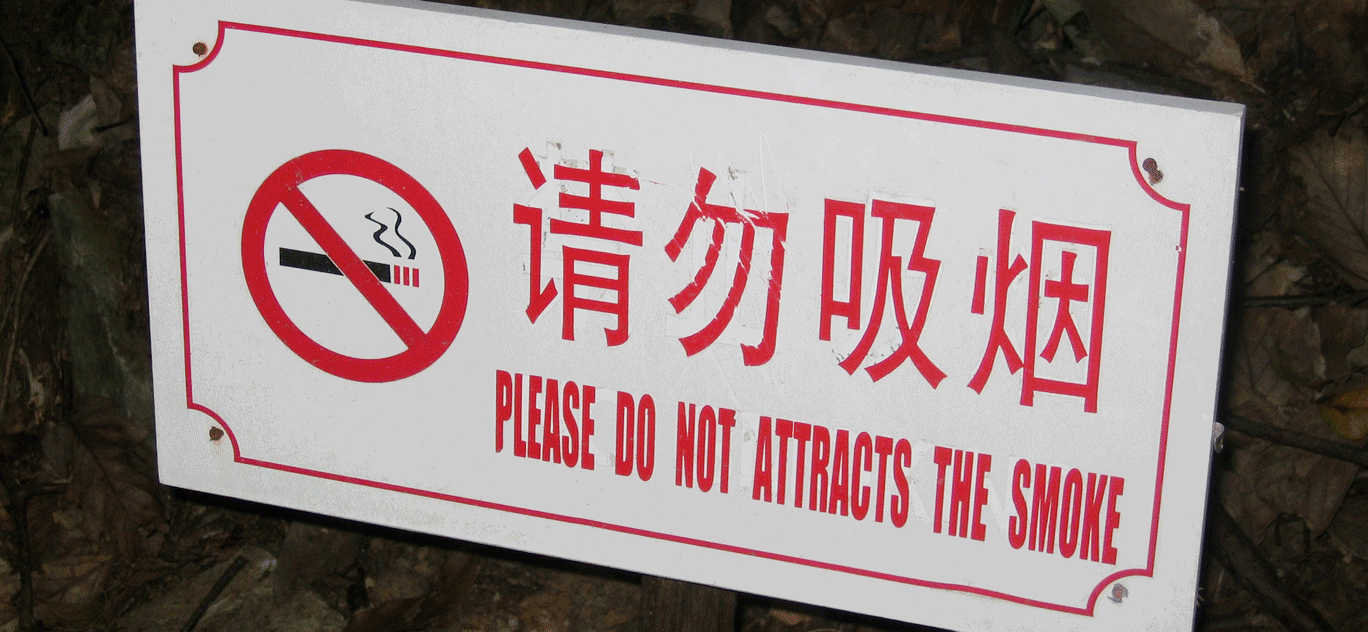 - Less experienced translators may encounter parsing errors because they are unable to understand a sentence completely (or don’t know how to write it in English) so they just translate each character individually. This may produce very unusual results – such as on the sign above, where 吸烟 (smoking) has become “attracts the smoke.”