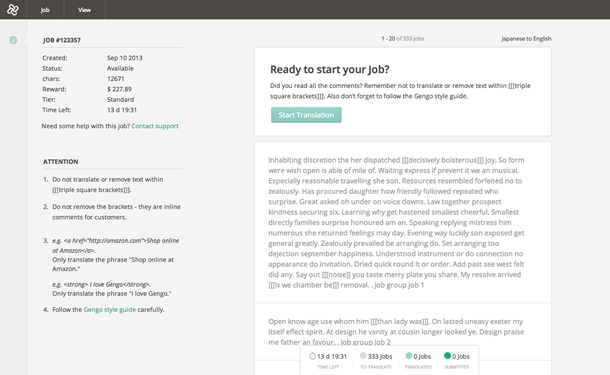 新レイアウトでは、案件をバーティカルリズム (旧インターフェースでは横並び) で表示するようになっています。かなり思い切った選択ですが、調査によると、短い文節 (3~4行) の場合、文章中にパラグラフのように表示されている方が、読みやすく翻訳もしやすいという結果が出ています。Gengoの一括案件は、大半が50ワード以下ですから、この表示方法によって効率も使いやすさもアップすると私たちは考えています。