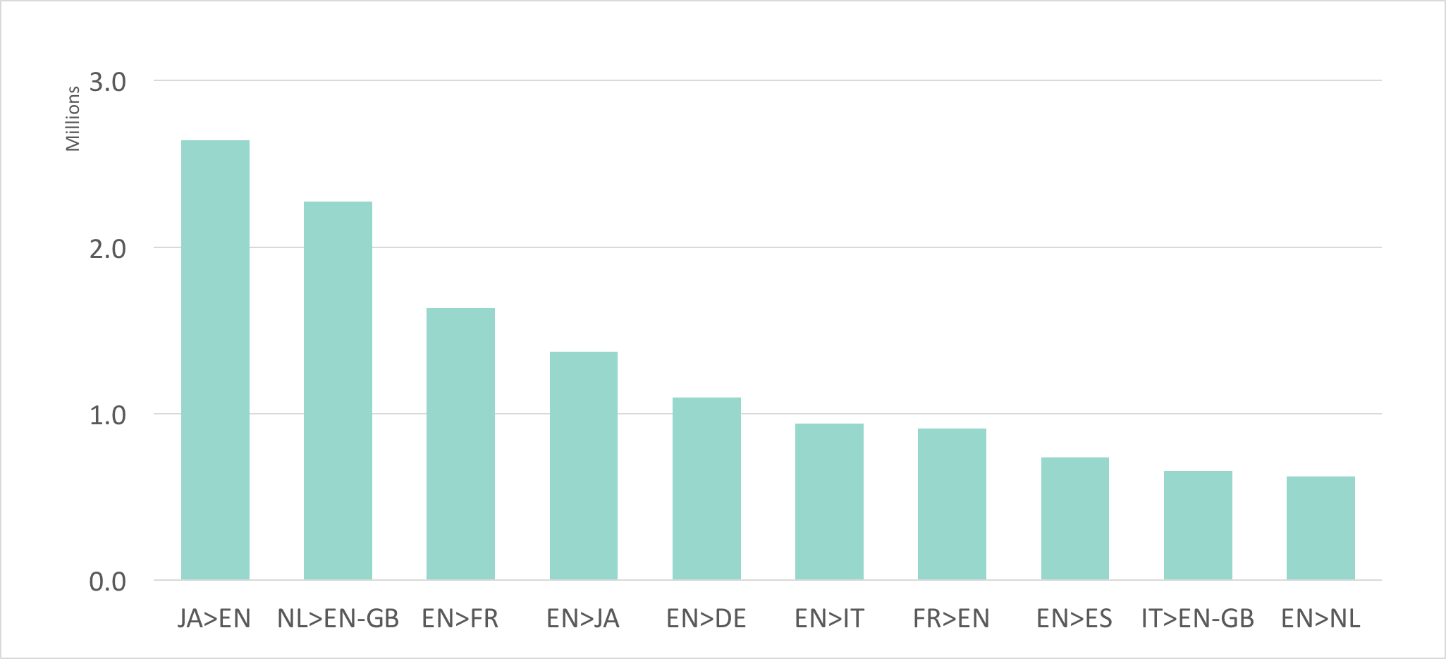 トップ10の言語ペアは先月と同じです。1月の翻訳量を上回る260万字が、日本語から英語に翻訳されました。オランダ語からイギリス英語、英語からフランス語、英語から日本語もそれぞれ230万語、160万語、140万語と順調な月となりました。