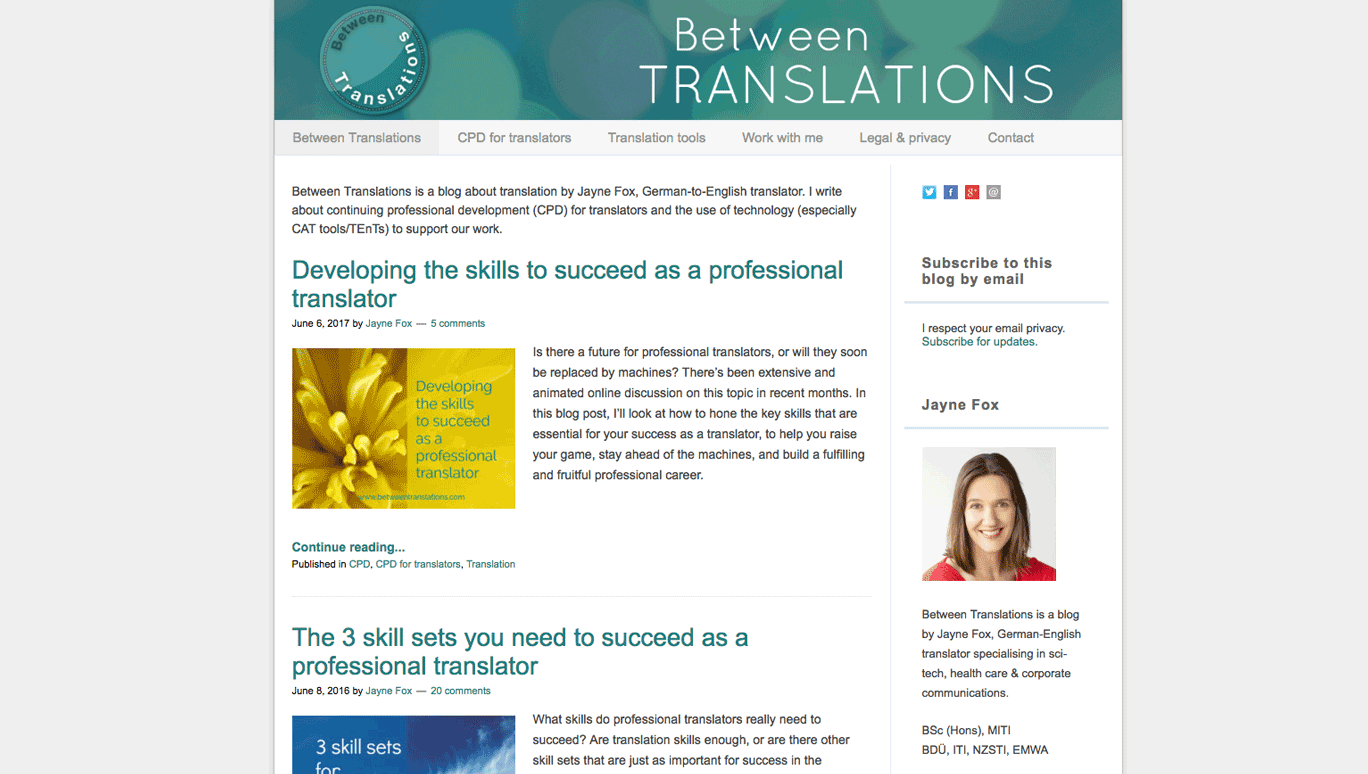 A blog by German to English translator Jayne Fox, Between Translations is a source full of useful articles for both novice and experienced translators alike — from tips on pricing your translation services to tips on translating for a global audience. She also dedicates one section of her blog to translation tools with step-by-step guides to using popular CAT tools, such as SDL Trados.