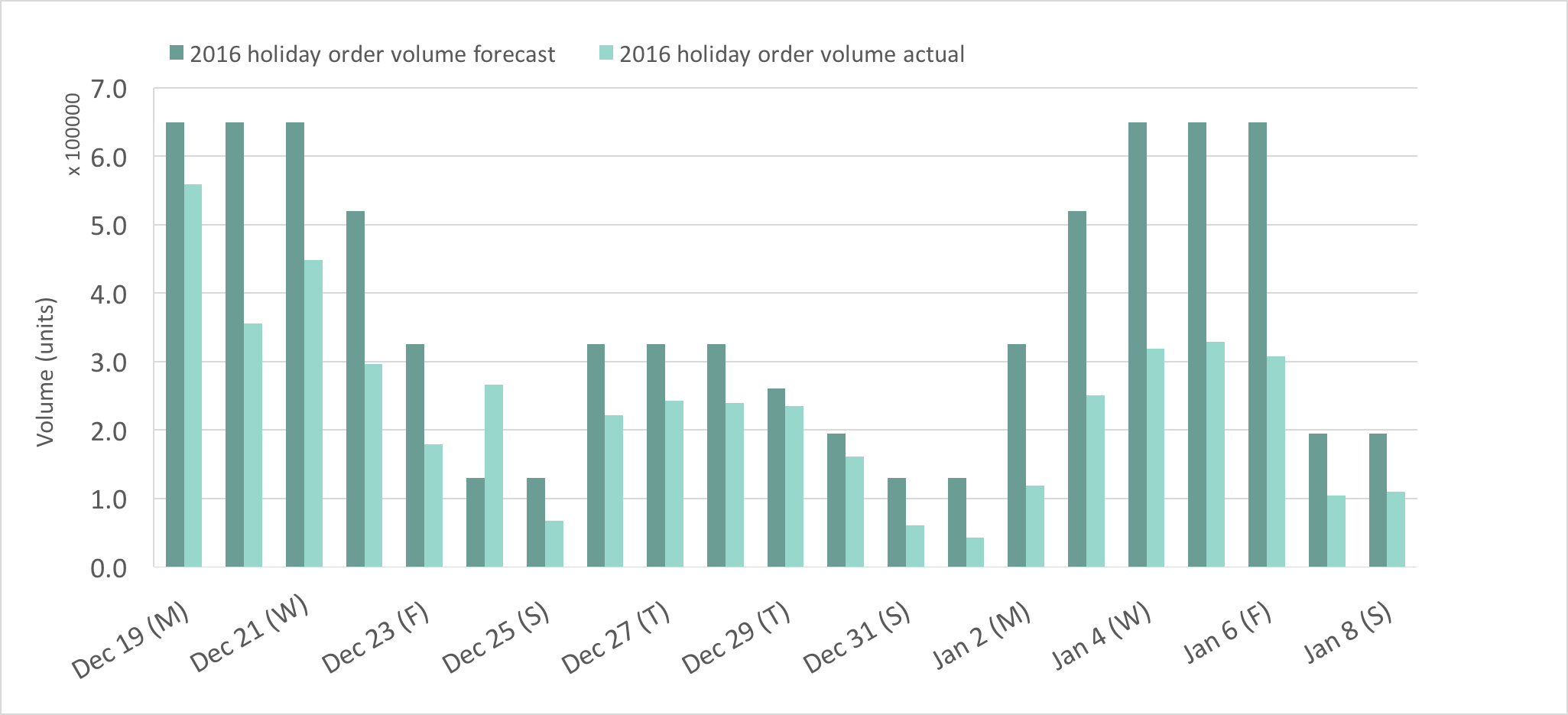 Chart 2: 2016 holiday order volume forecast vs actual