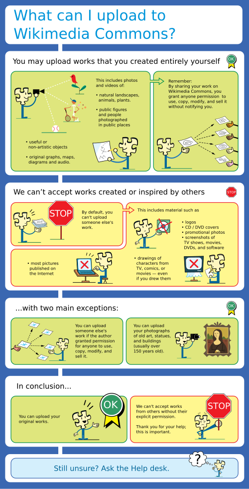 This page gives non-lawyers an overview of complicated copyright laws through an example-based tutorial. It aims to help uploaders decide whether an image or other media file is acceptable on Wikimedia Commons. If you are a re-user looking for information on how to use Commons content in your own work, see Commons:Reusing content outside Wikimedia.