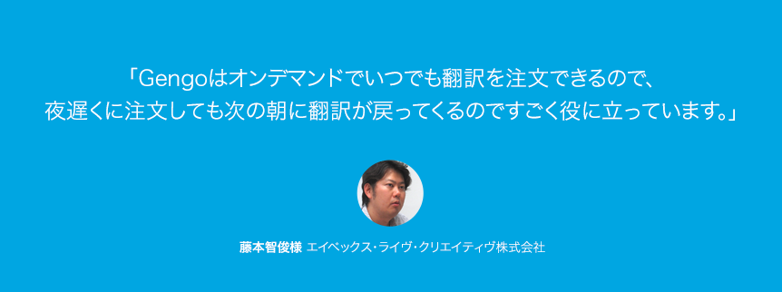 日本のお客様のみならず、外国人のジャパニーズカルチャーファンのニーズにも応えるために、アイドル、アニメ、声優などのイベント情報を多言語化しています。エイベックス・ライヴ・クリエイティヴでは、より多くのお客様にLivePocketの魅力を発信すべく、Gengoの翻訳サービスを利用しています。今回は、LivePocketのプロデューサーであるコンテンツ事業本部所属の藤本智俊様にお話を伺いました。