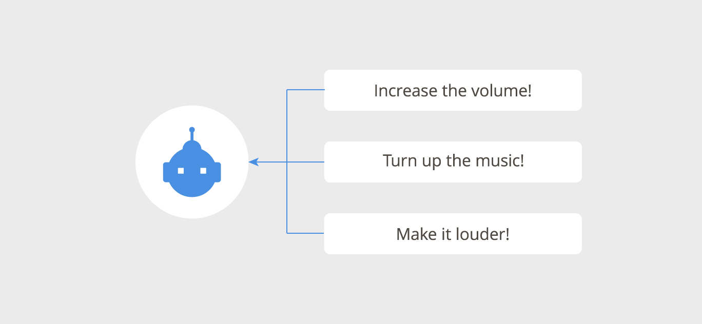 ある特定の領域では非常に優れている機械がその他の領域では全く役に立たないことがあるということはよく知られています。これは、機械による言語理解にも当てはまります。チャットボットに「それを私のショッピングバスケットに入れて」と言えば、チャットボットはすぐにその仕事を完了することができます。しかし、同じチャットボットに「それを私のカートに加えて」と言うと、命令に使われる言葉が異なるので、チャットボットがその命令を処理できないということが生じる場合があります。人間が言語を学習する際、同じことを意味する様々な言い方を習得する必要があるのと同じように、チャットボットのアルゴリズムはたくさんの同じようなフレーズで学習させてそれらの関係を理解し、新しいフレーズの意味を推測できるようにならなければなりません。