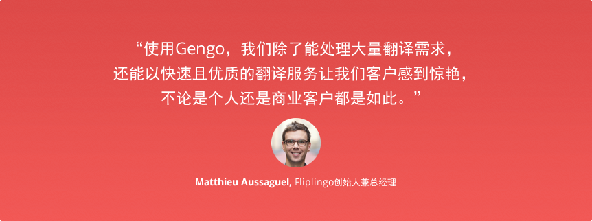 Gengo 简单易用的平台经过验证,是适合 Fliplingo 的完美解决方案。借助大量客户端库和文档,植入 Gengo API 就像复制与粘贴这样简单。对于额外支持服务,如果 Fliplingo 开发者遇到任何问题,Gengo 的专业系统集成团队随时待命并帮助解决。