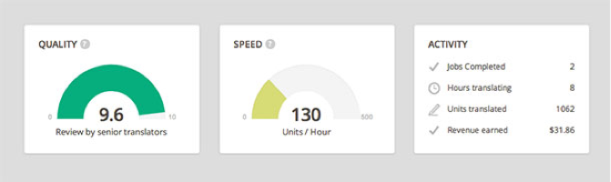 皆さんのスピードは、皆さんが翻訳したユニット (語または文字) 数をGengoでの作業時間 (案件を受注した時から提出するまでの時間) で割って、算出されます。スピードを対象にしたのはGengoのサービスの重要な特徴であるためで、また翻訳者が、案件を受注だけして翻訳を開始しない事態を減らす目的があります。皆さんにはスピードのために品質を犠牲にしていただきたくはありませんが、案件を受注した後は素早く作業に取り掛かっていただき、できる限り早くお客様に案件をお返ししていただきたいと思います。最も望ましいスピードを250ユニット/時としてまずは設定しました。皆さんの平均的なスピードと比較していかがですか?