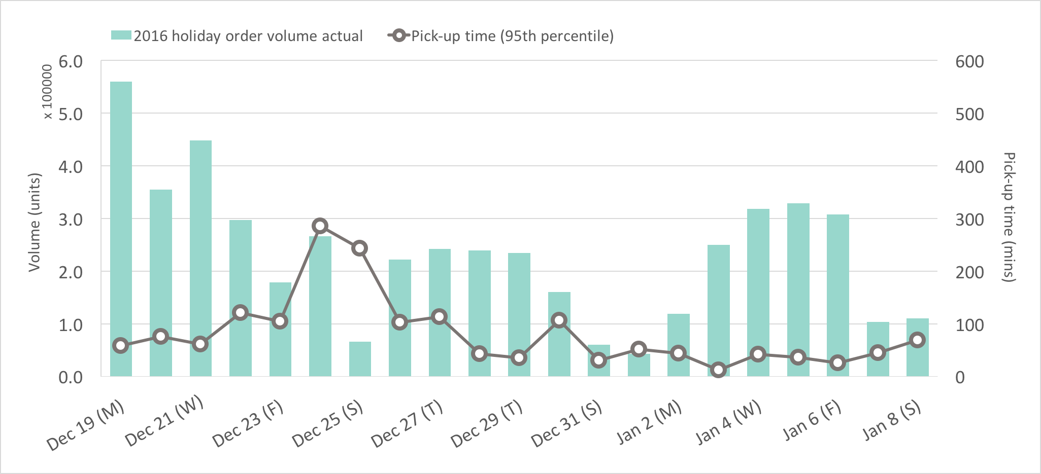 Chart 3: 2016 holiday order volume actual and pick-up times